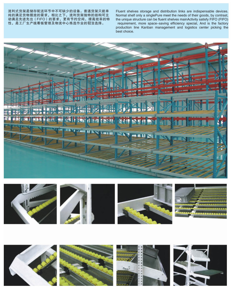 流利式貨架廣泛應(yīng)用于制造業(yè),商業(yè),配送中心,裝配車間以及出貨頻率較高的倉庫流利式貨架:采用輥輪鋁合金,鈑金等流利條,利用臺(tái)架自重實(shí)現(xiàn)先進(jìn)先出,存儲(chǔ)方便,適用于裝配線兩側(cè)配送中心等場(chǎng)所。